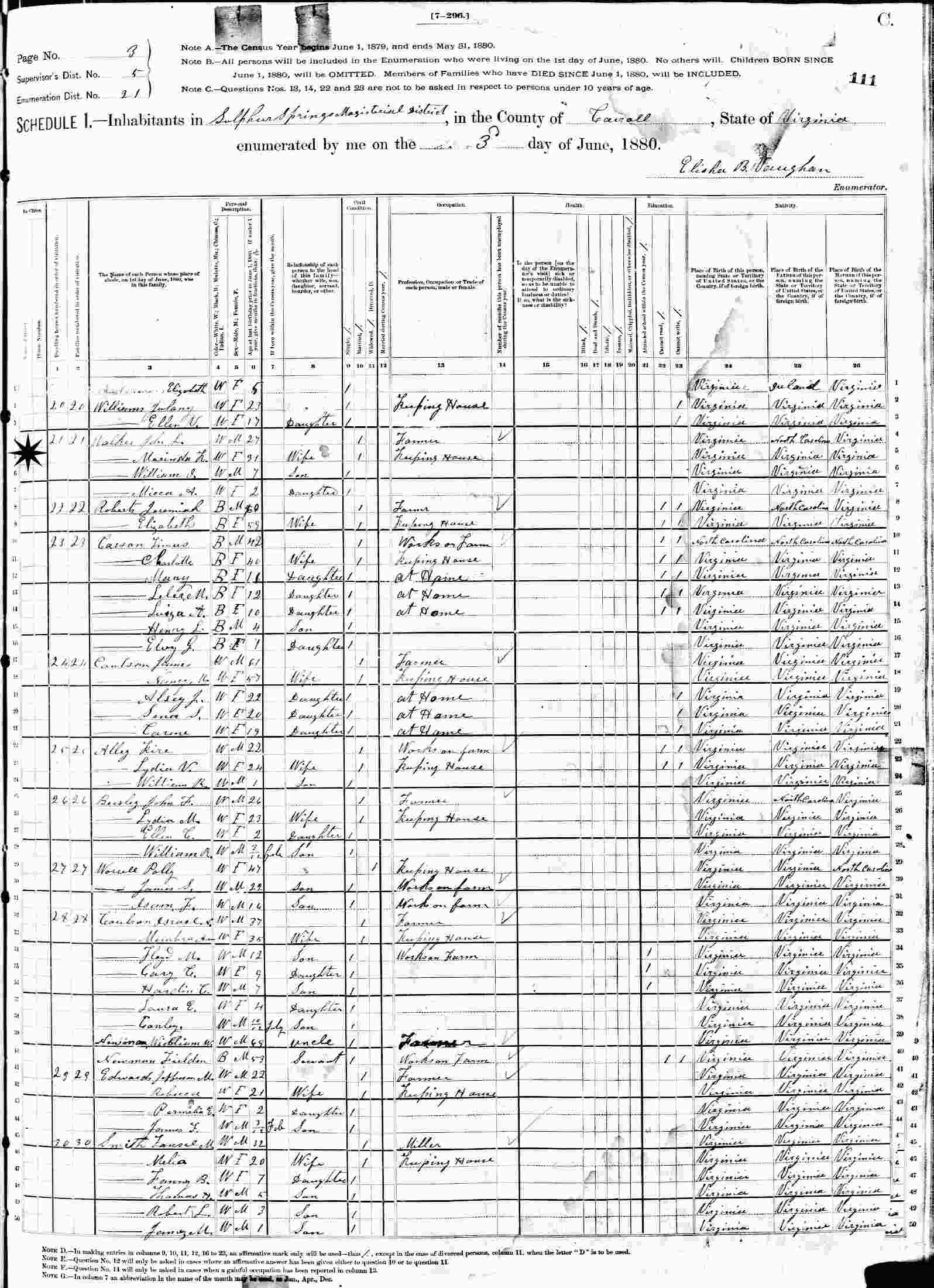 June 3, 1880 - Sulphur Springs Magisterial District, Supervisor's District 5, Enumeration District 21, Carroll County, Virginia.
