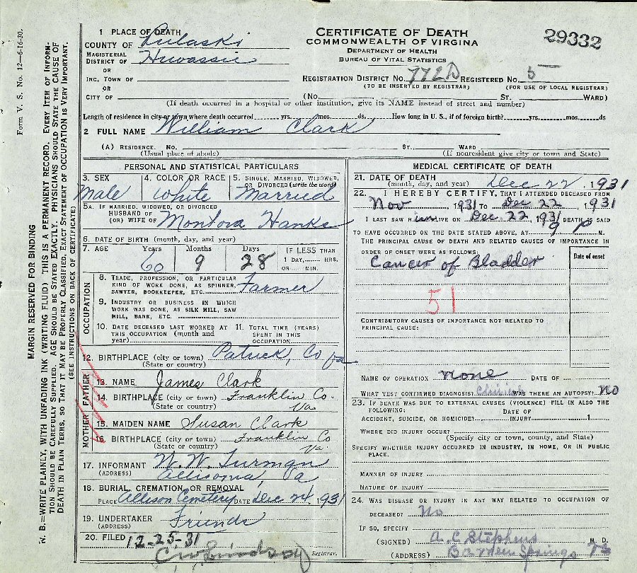 Died: December 22, 1931 in Allisonia, Pulaski County, Virginia.