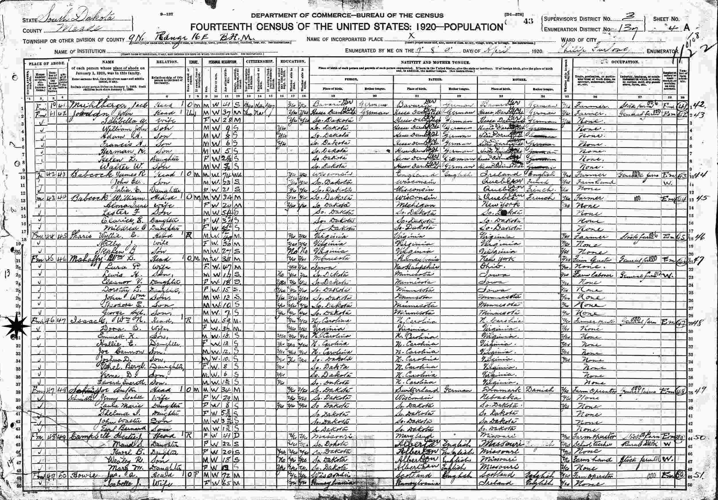 April 7-9, 1920 - 9N, Rdngr 16E, B.H.M., supervisor's District 3, Enumeration District 137, Meade County, South Dakota.