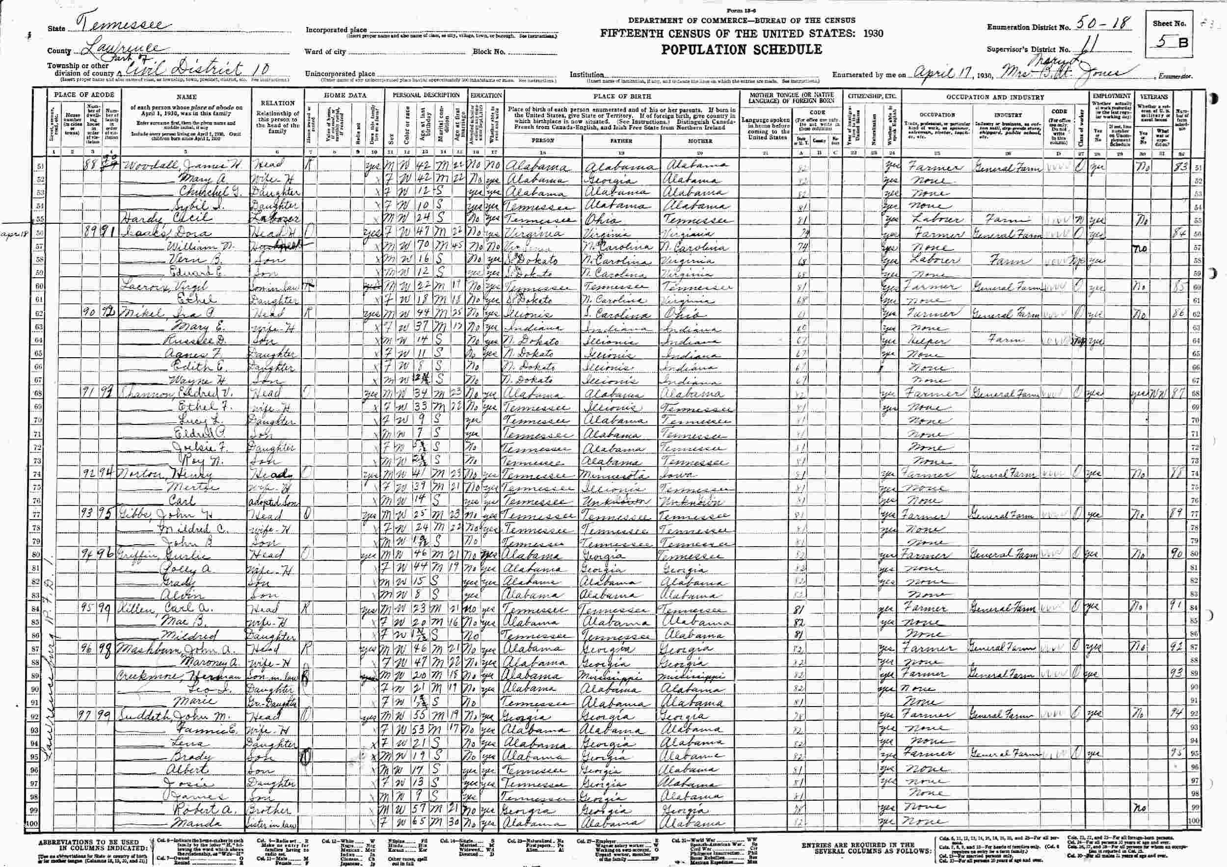 April 18, 1930 - Lawrenceburg R.F.D. 1, Civil District 10, Supervisor's Disrict 11, Enumeration District 50-18, Lawrence County, Tennessee.