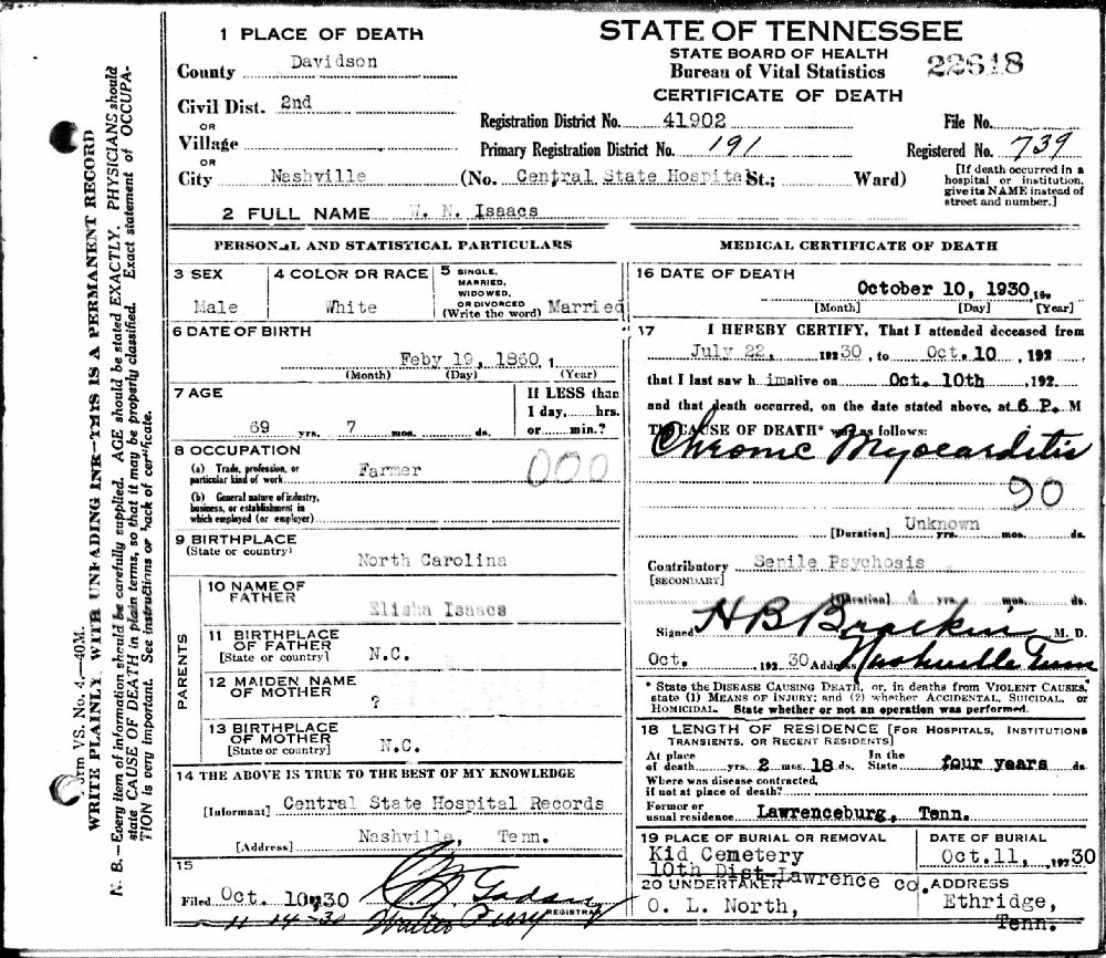 Died: October 10, 1930 in Nashville, Davidson County, Tennessee.