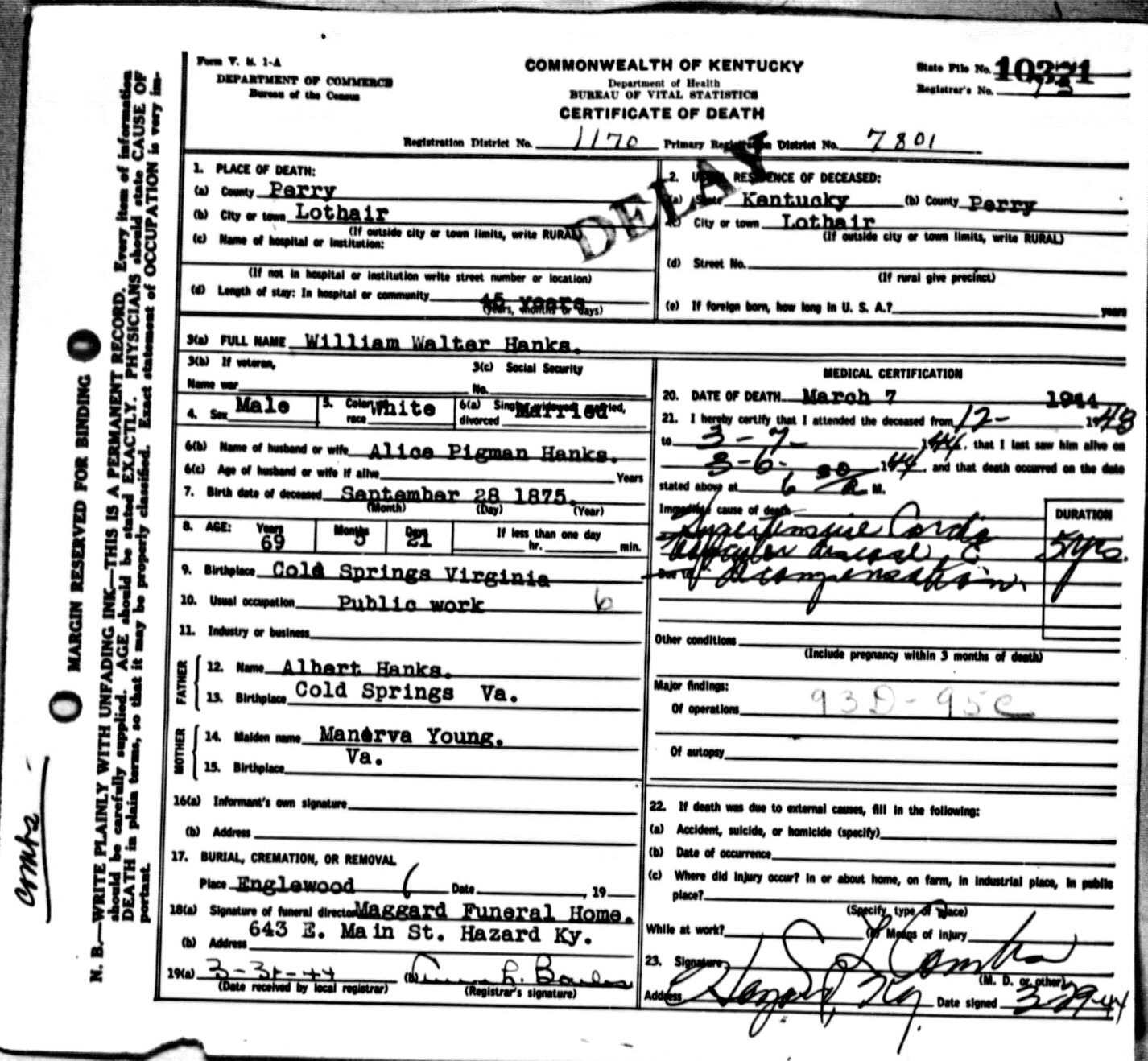 Died: March 7, 1944 in Lothair, Perry County, Kentucky.