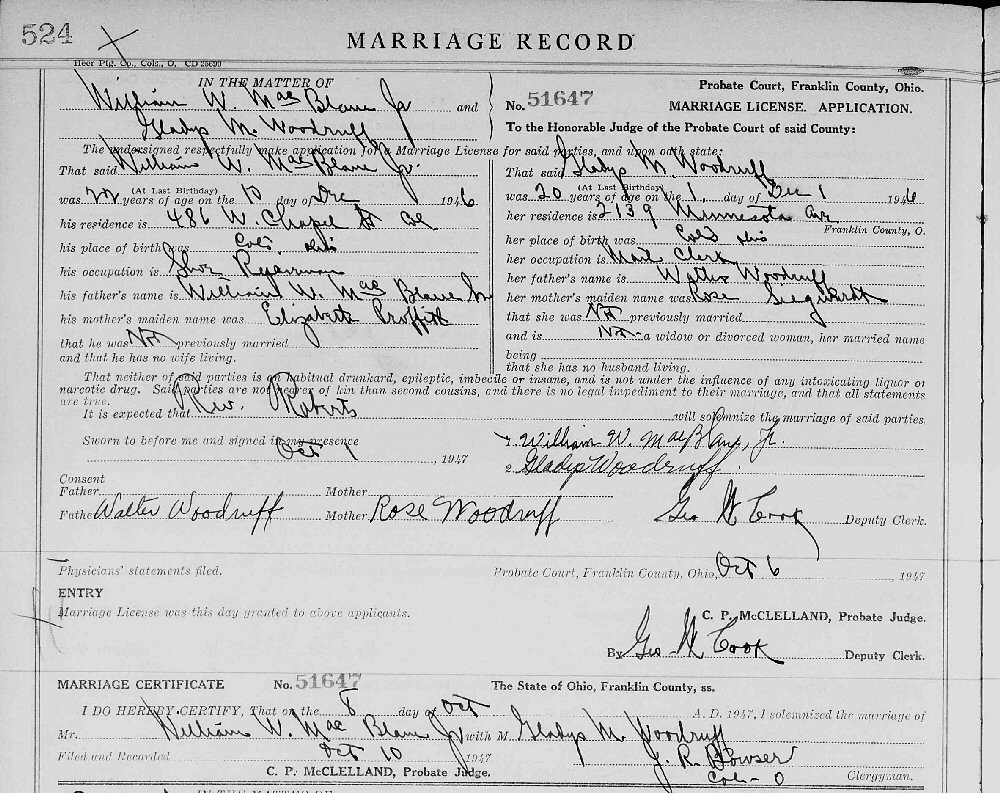Married: Gladys Marie Woodruff in October 08, 1937 in Franklin County, Ohio.