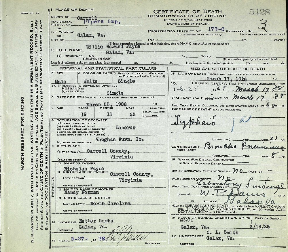 Died: March 17, 1928 in Galax, Carroll County, Virginia.