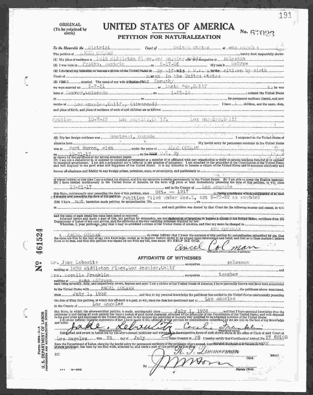 Petition for Naturalization: July 25, 1939 - Certificate #67023 Los Angeles, California.