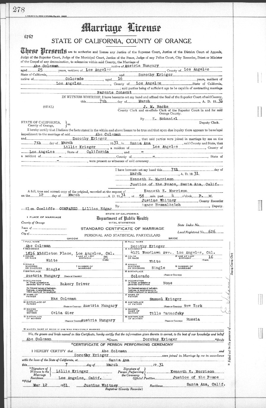 Married: Dorothy Krieger March 7, 1931 in Santa Ana, California. (Divorce.)