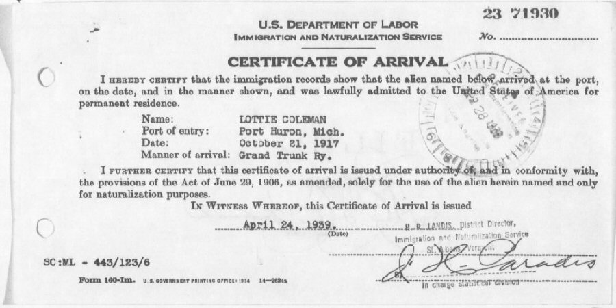 Certificate of Arrival: April 24, 1939; issued St. Albans, Vermont.