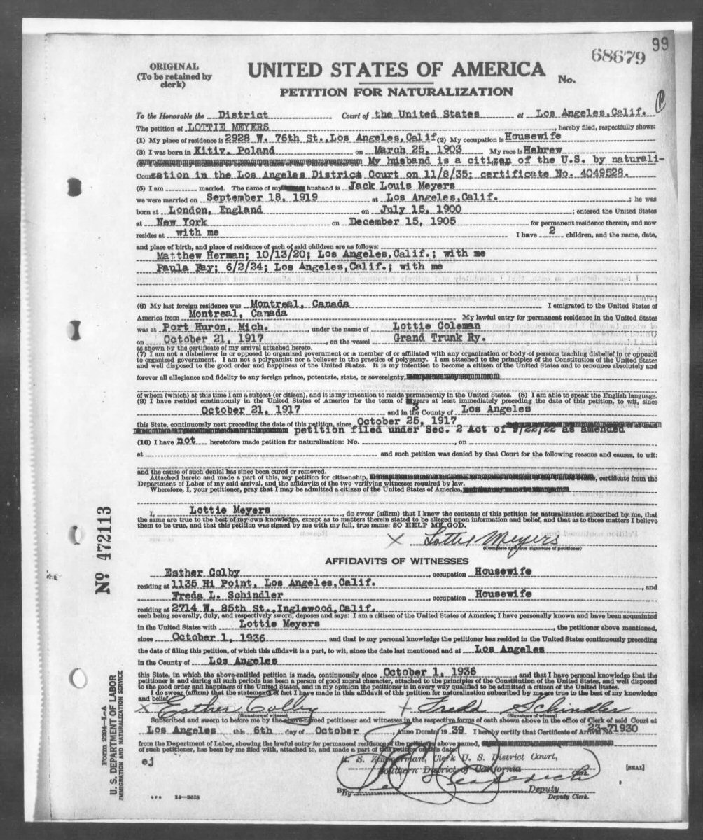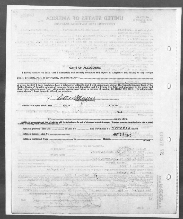 Married: Jack Louis (nee Jacob Louis Schmaier) Meyers September 18, 1919 in Los Angeles, Los Angeles County, California. (Marriage Registered: September 24, 1919.)