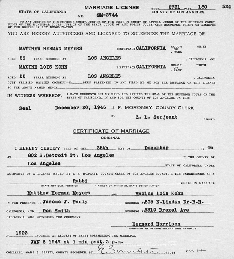 Married: Maxine Lois Kohn December 26, 1946 in Los Angeles County, California.