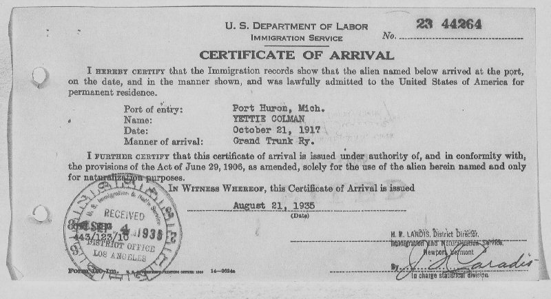 Certificate of Arrival: #23 44264 August 21, 1935.