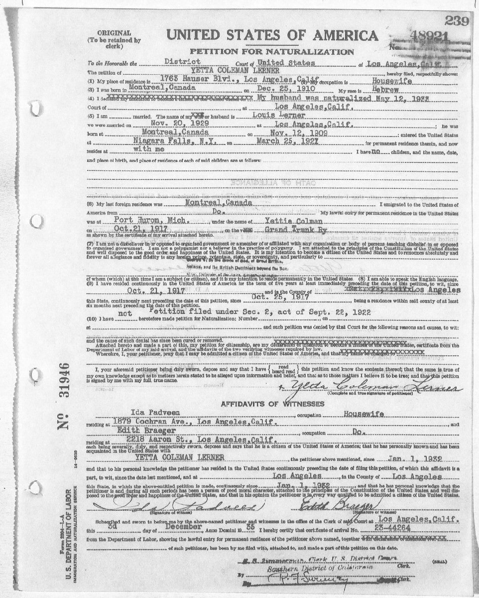 Naturalization: Certificate #4051005 March 13, 1966 - Los Angeles, Los Angeles County, California.
