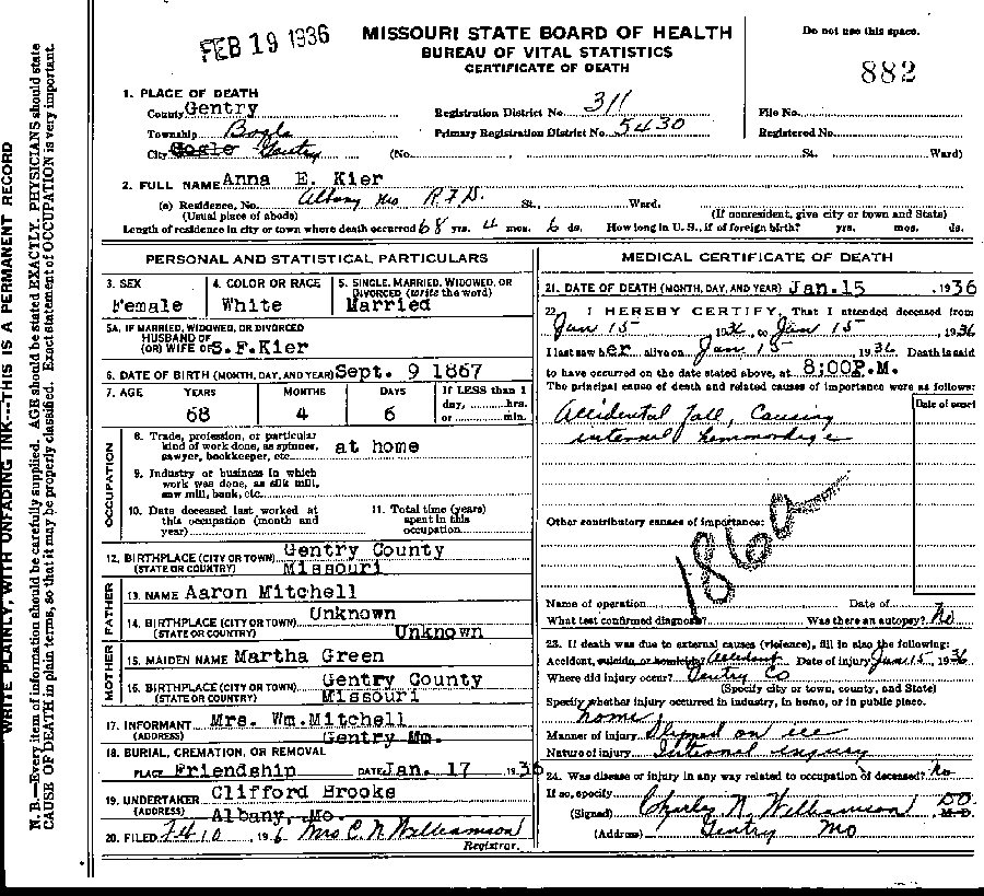 Died: January 15, 1936 in Albany, Gentry County, Missouri.
