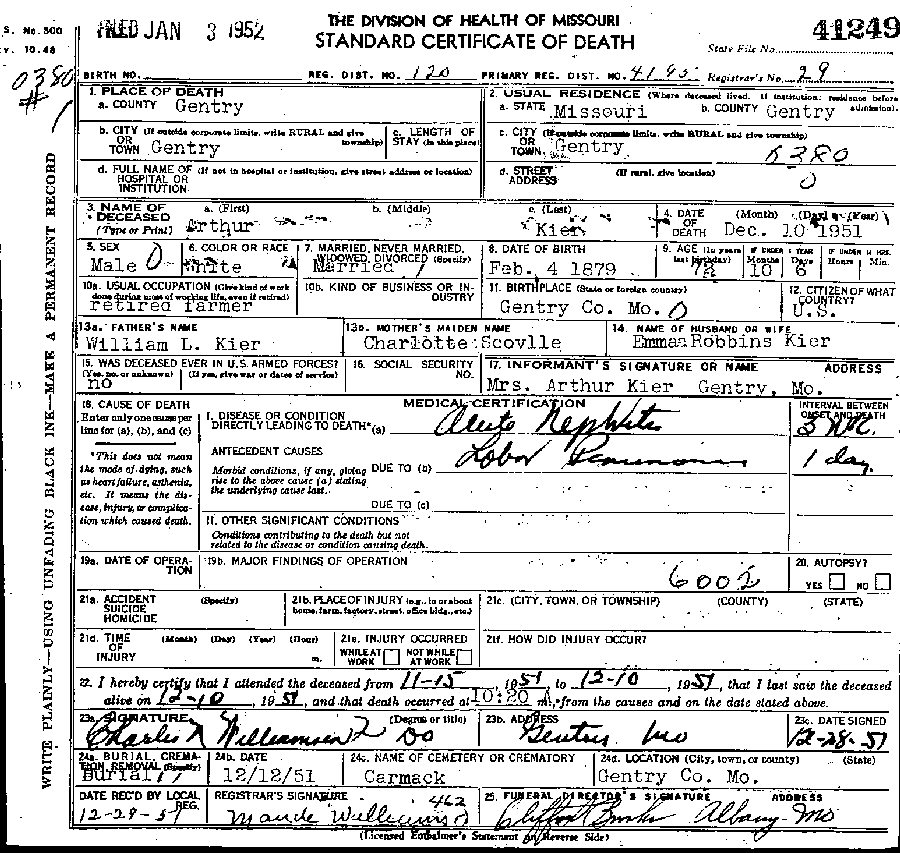 Died: December 10, 1951 in in Albany, Gentry County, Missouri.