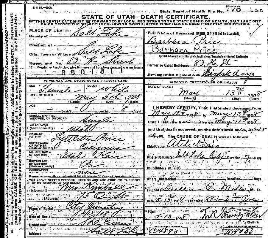 Died: May 13, 1908 in Salt Lake City, Salt Lake County, Utah.
