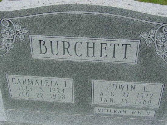 Notes for EDWIN E BURCHETT: Son of Roy and Merle (Crees) Burchett. Born: August 27, 1922 in Unknown. Died: January, 1989 in Unknown. Married: Carmaleta L Bryant March 30, 1946 in Unknown.