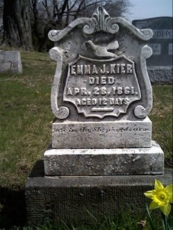 Notes for EMMA J KIER: Daughter of James M and Margaret Ann (Sproul) Kier. Born: April 16, 1861 in Unknown. Died: April 28, 1861 in Unknown. Buried: Plot: A32; Prospect Cemetery, Brackenridge, Allegheny County, Pennsylvania.