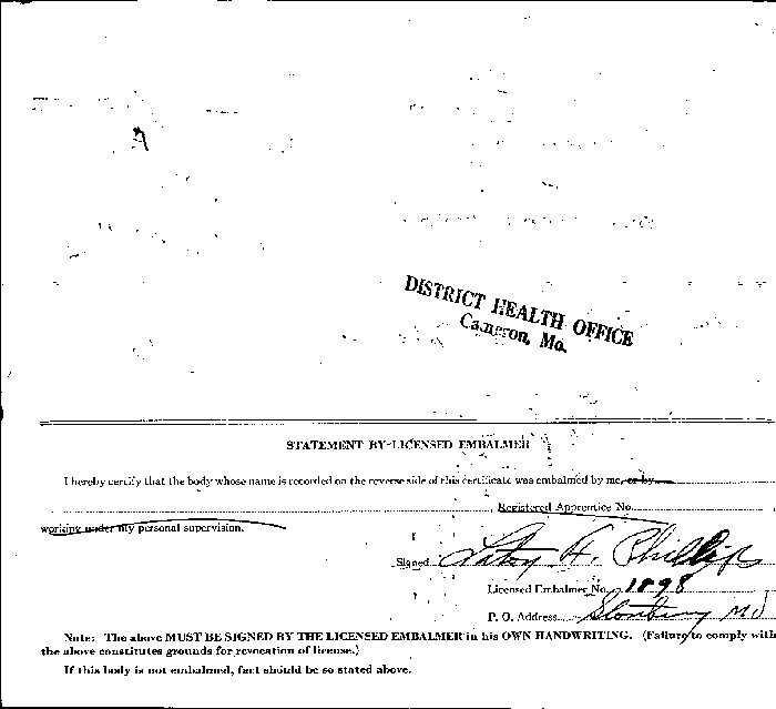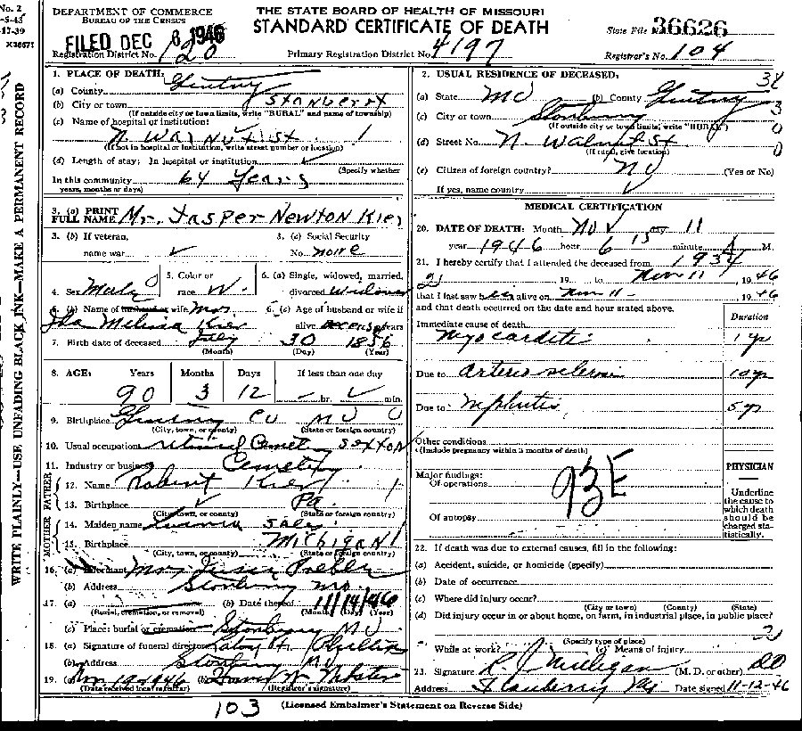 Died: November 11, 1946 in Stanberry, Gentry County, Missouri.
