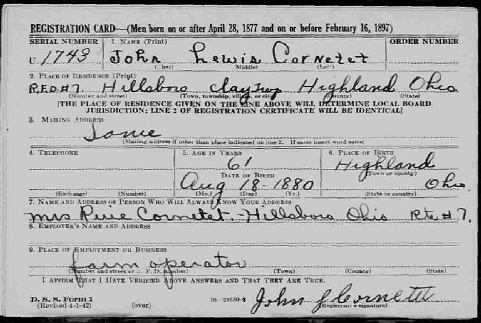 Married: (1) Florence Carey November 22, 1910 in Highland County, Ohio.