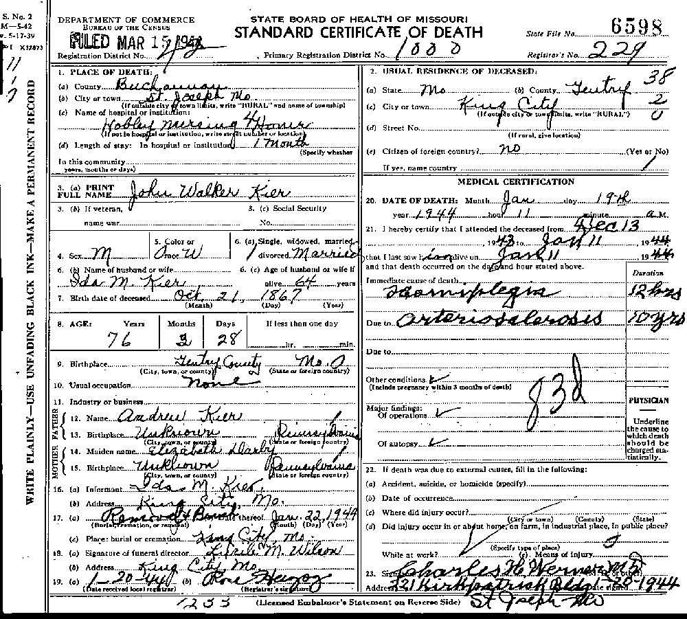 Died: January 19, 1944 in King City, Gentry County, Missouri.