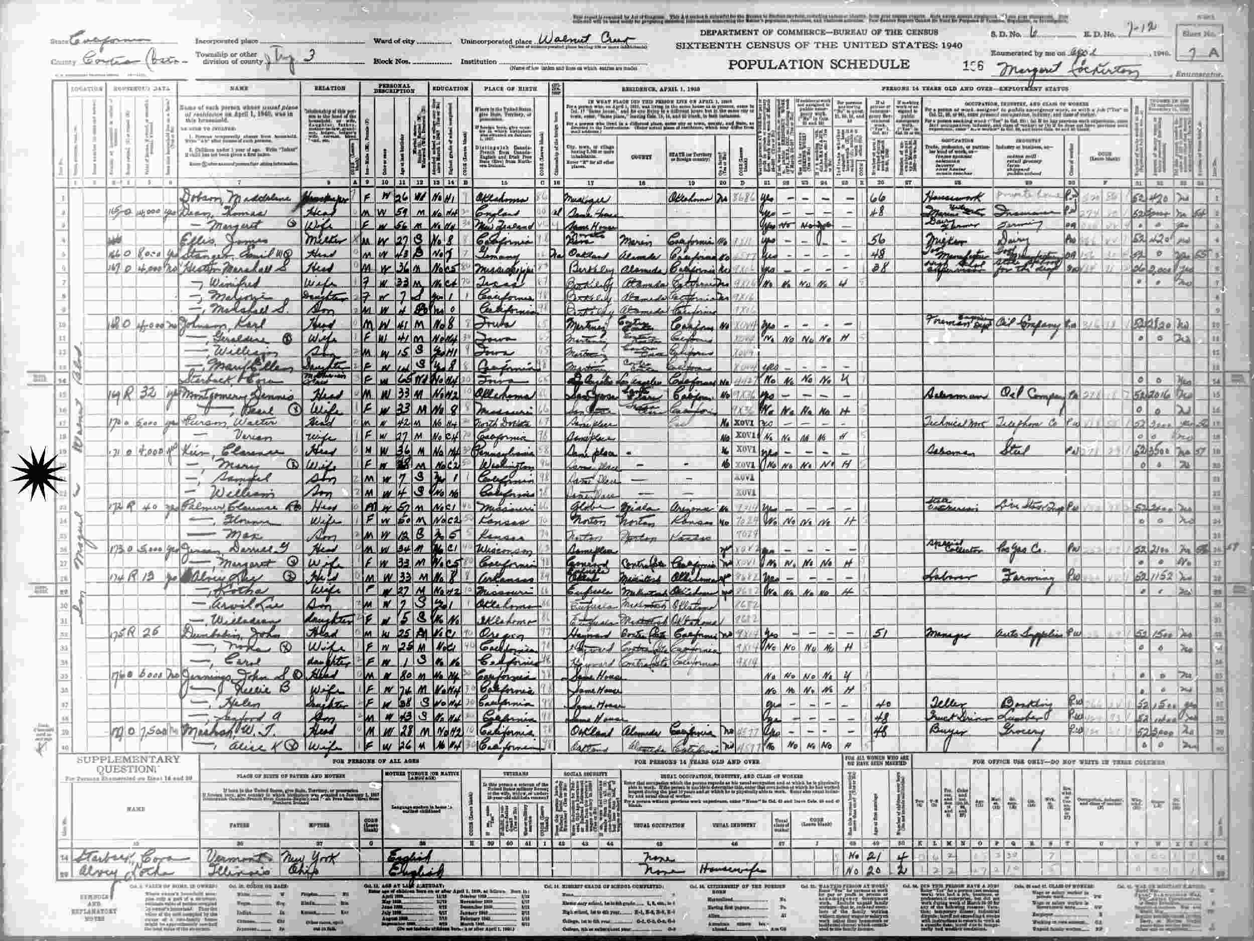 April, 1940 - Walnut Creek, Judicial Township 3, Contra Costa County, California.