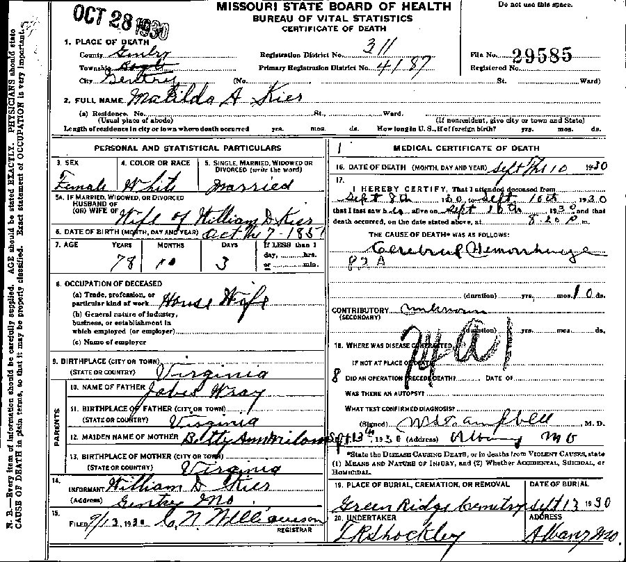 Died: September 10, 1930 in Gentry, Gentry County, Missouri.