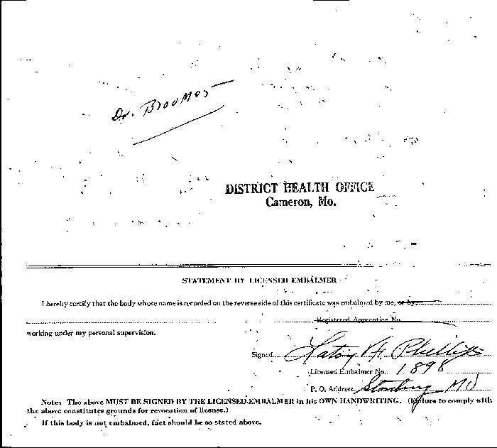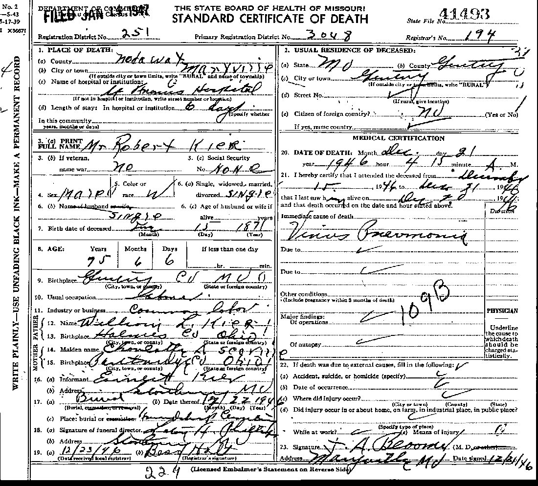 Died: December 21, 1946 in Maysville, Nodaway County, Missouri.