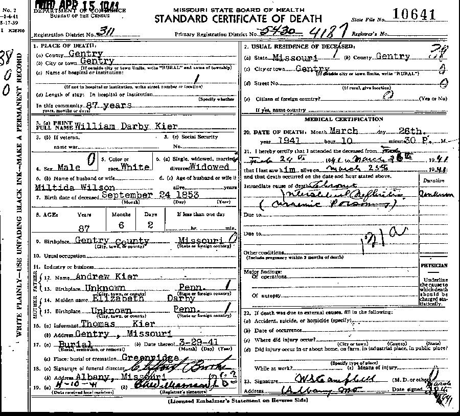 Died: March 26, 1941 in Gentry, Gentry County, Missouri.