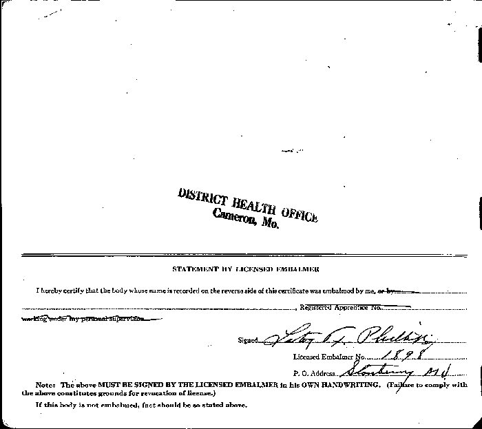 Died: September 15, 1948 in Stanberry, Gentry County, Missouri.