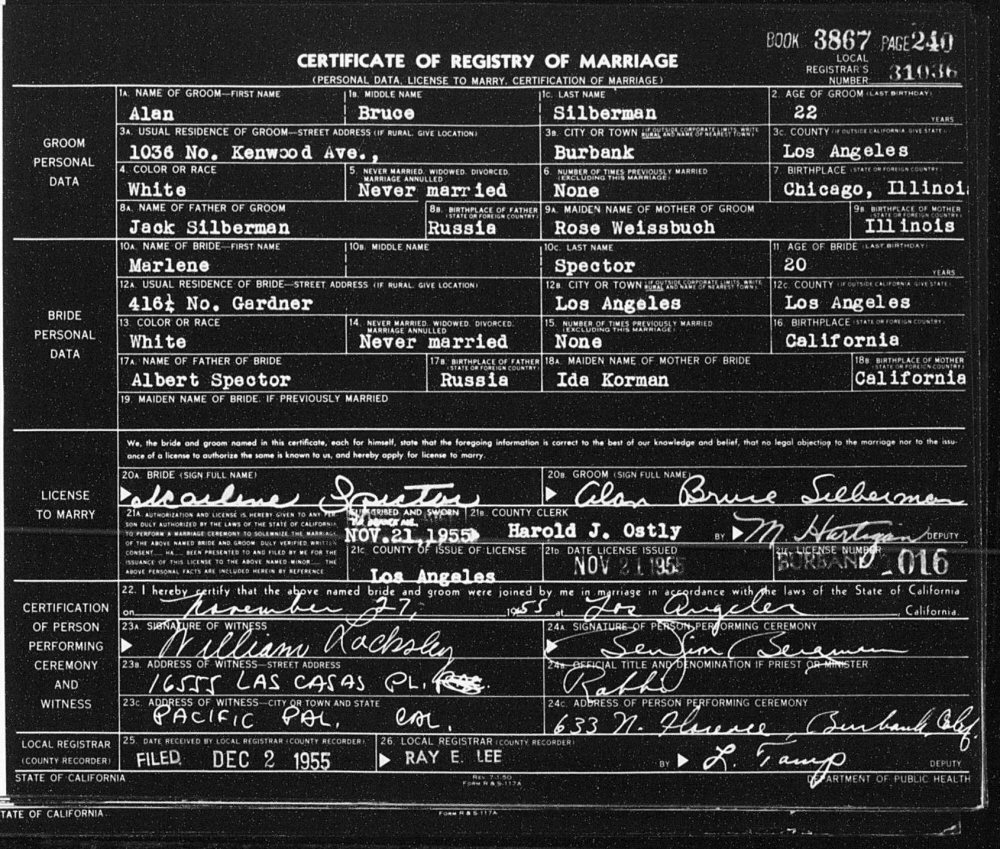 Married: Marlene Spector November 27, 1955 in Los Angeles County, California.