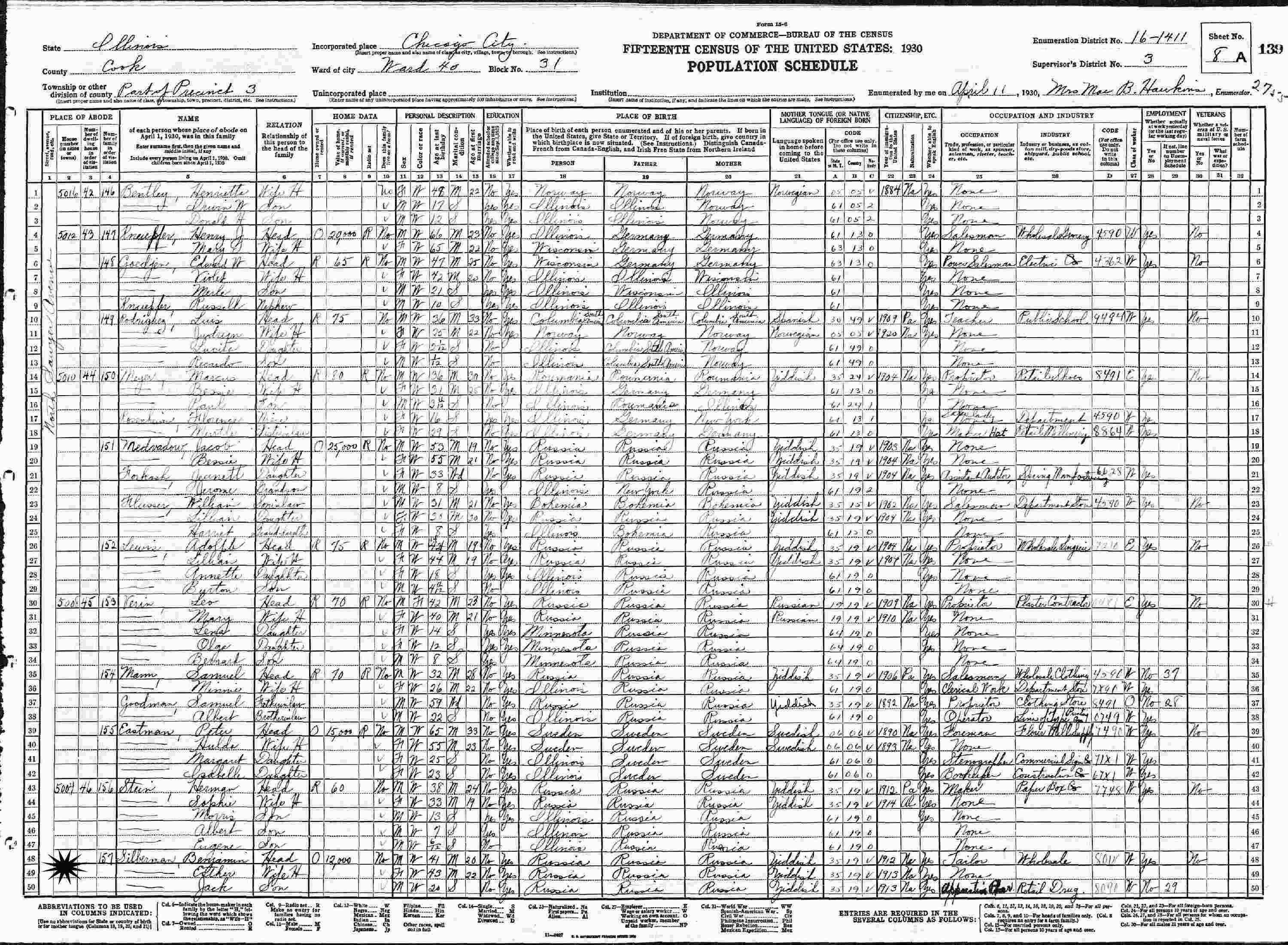 April 11, 1930 - 5004 North Sawyer Avenue, Precinct 3, Ward 40, Block 3, Supervisor's District 3, Enumeration District 16-1411, Chicago, Cook County, Illinois.