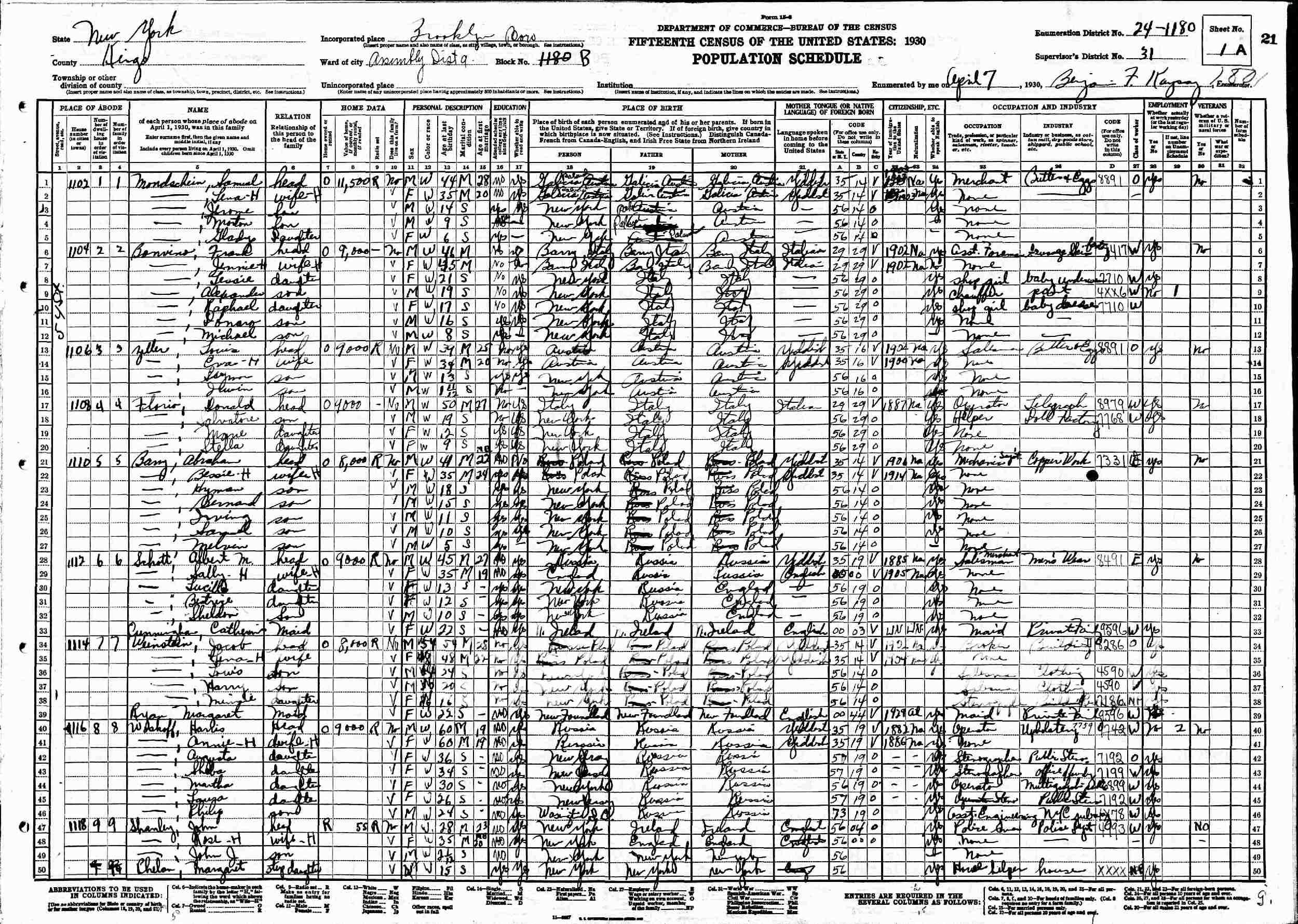 April 7, 1930 - 1110 54th, Assembly District 9, Block B, Supervisor's District 31, Enumeration District 24-1180, Brooklyn, Kings County, New York.