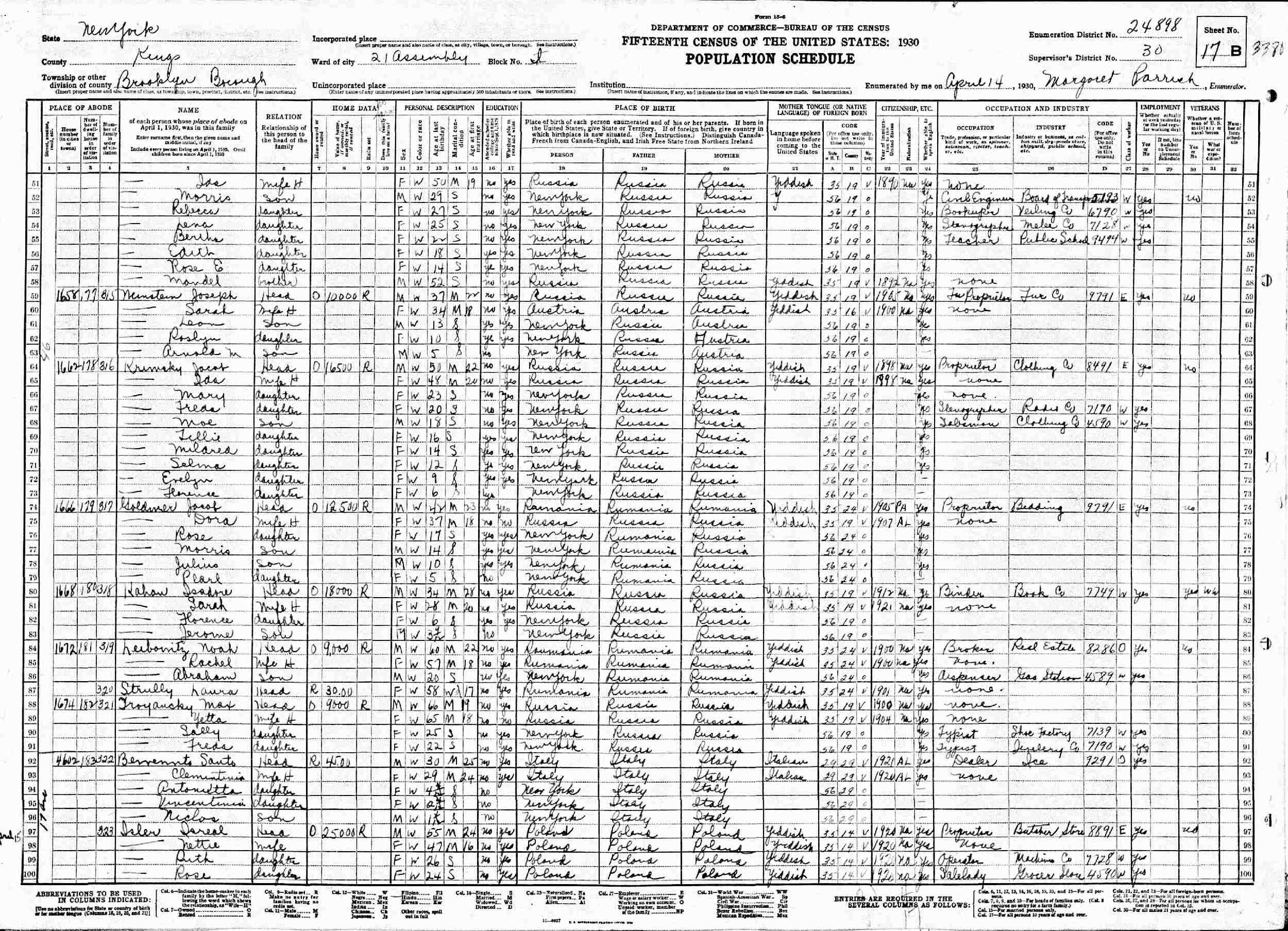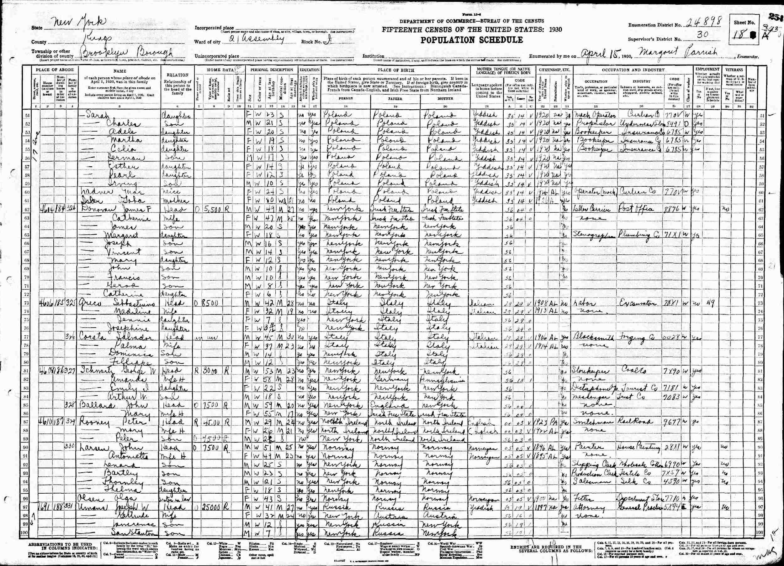 April 15, 1930 - 4602 17 Avenue, Assembly District 21, Block J, Supervisor's District 30, Enumeration District 24898, Brooklyn, Kings County, New York.