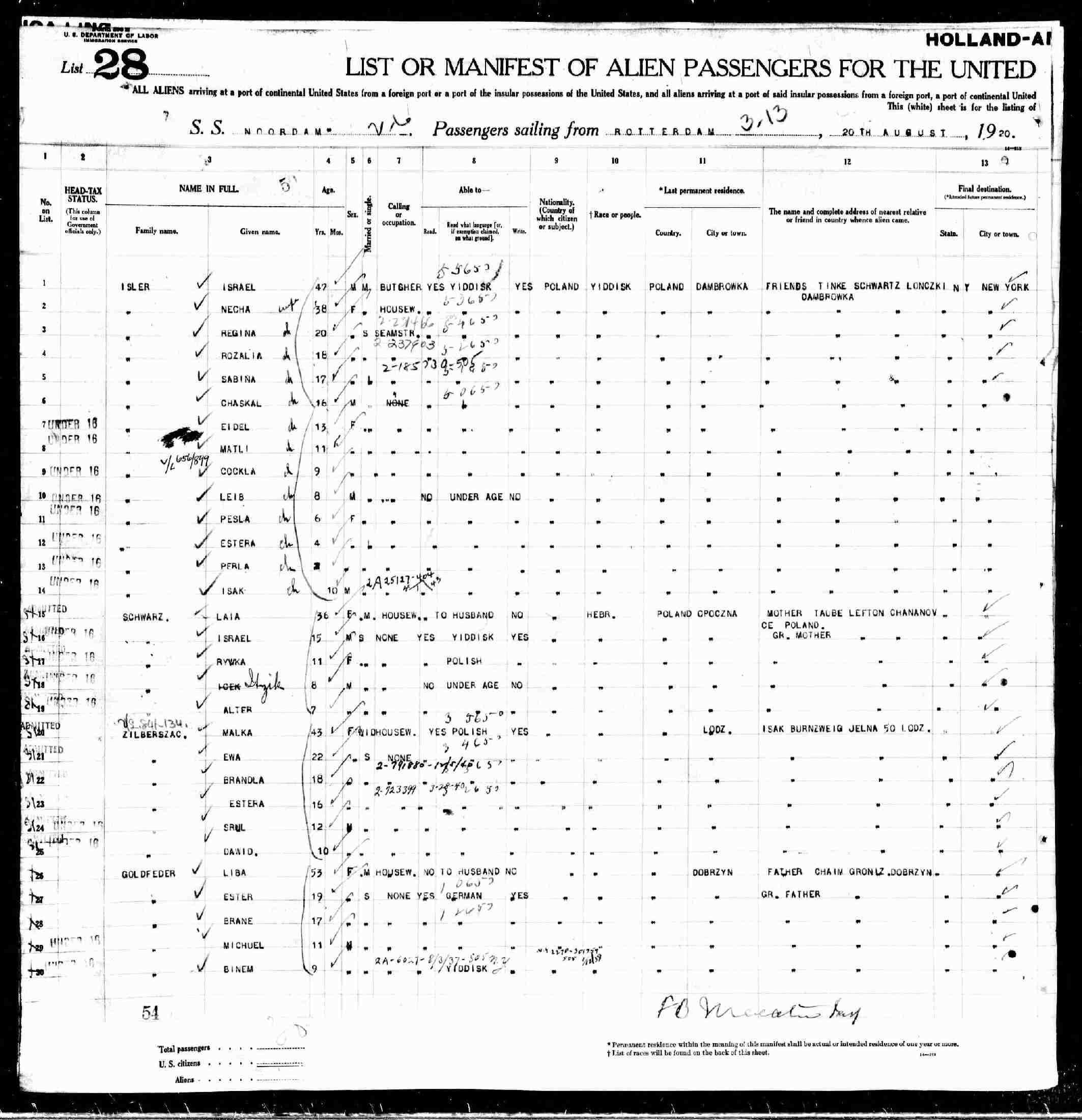 Immigration: August 20-30, 1920 - Rotterdam to New York City; Ship: S.S. Noordam.