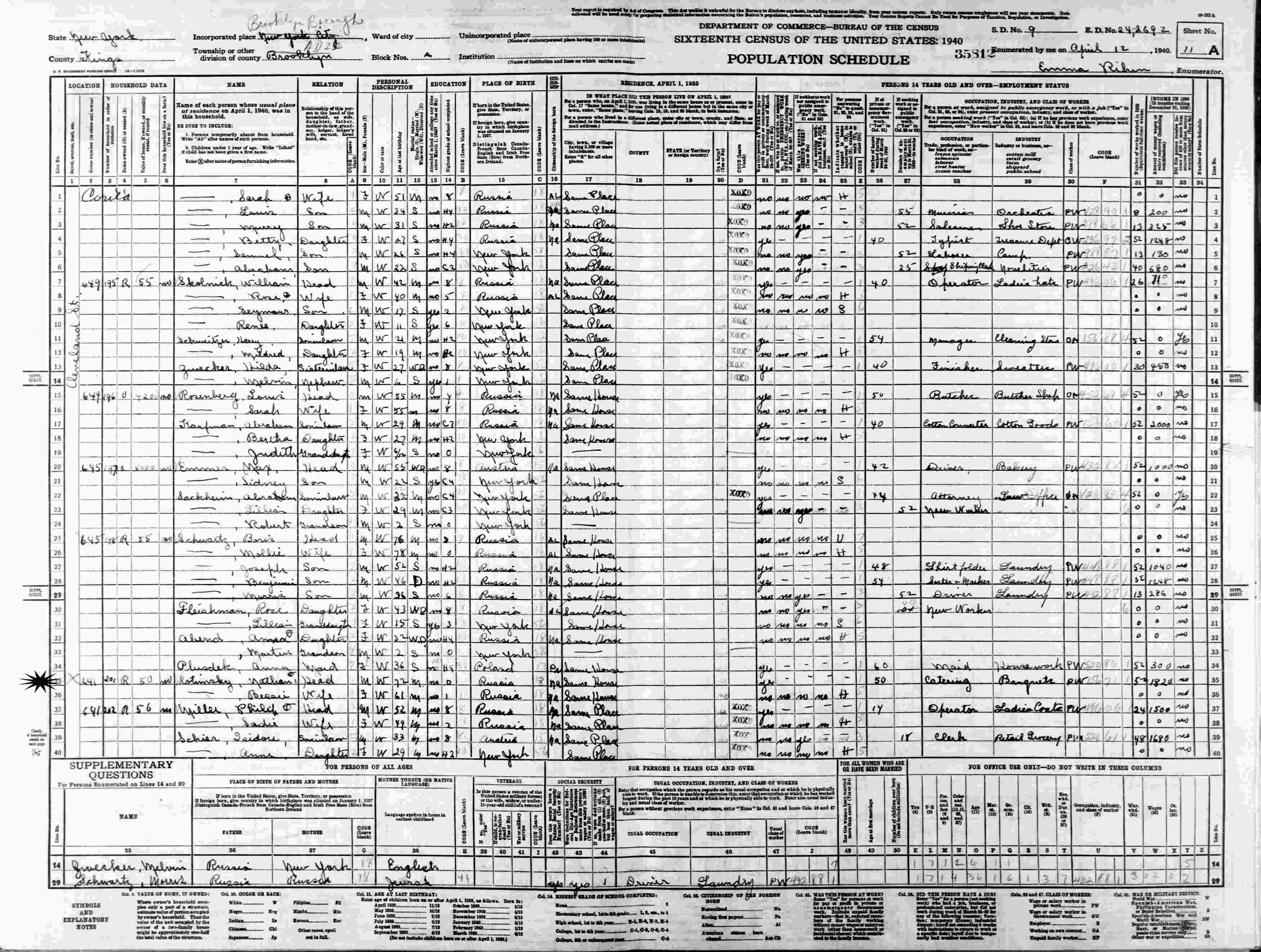 April 3, 1930 - 641 Cleveland Street, Block A, Supervisor's District 29, Enumeration District 24-513, Brooklyn, Kings County, New York (w/son-in-law and daughter Jacob and Anna Tuchman).