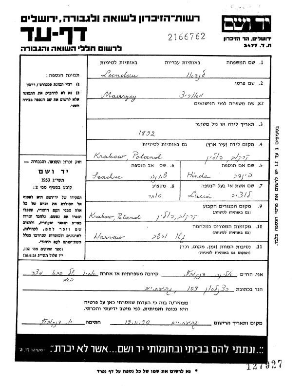 Notes for MOURYCY "MORITZ" LANDAU: Son of Szacha and Hinda (Margulies) Landau. Born: 1892 in Krakow, Poland. Died: Unknown in Shoah. Married: Lucia Monke Unknown in Unknown.