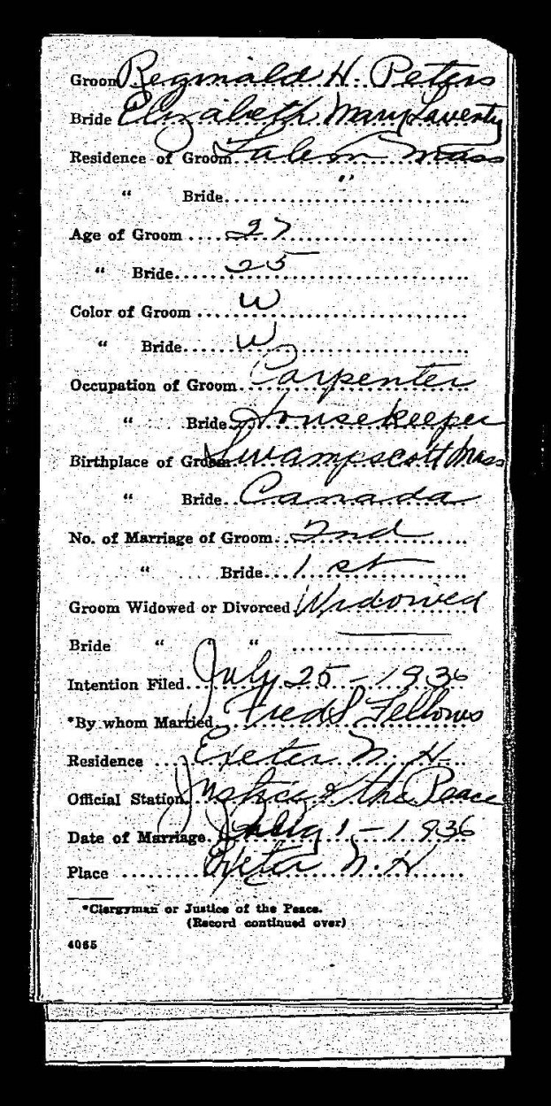 Married: Reginald H Peters August 1, 1936 in Exeter, Rockingham County, New Hampshire.
