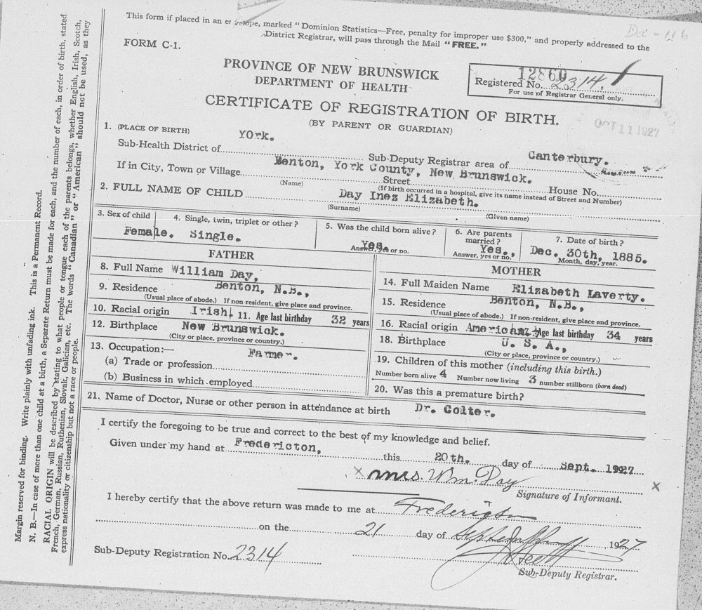 Notes for INEZ ELIZABETH DAY: Daughter of William and Mary Elizabeth (Laverty) Day. Born: December 30, 1885 in Benton, York, New Brunswick, Canada. Died: Unknown in Unknown.