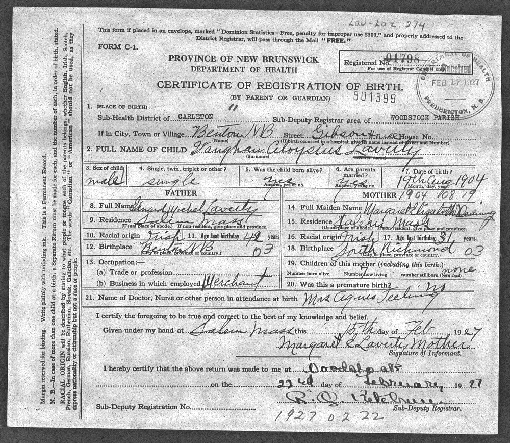 Notes for VAUGHAN ALOYSIUS LAVERTY: Son of Edward Michael and Margaret (Denning) Laverty. Born: August 19, 1904 in Benton, Carelton, New Brunswick, Canada. Died: Unknown in Unknown.