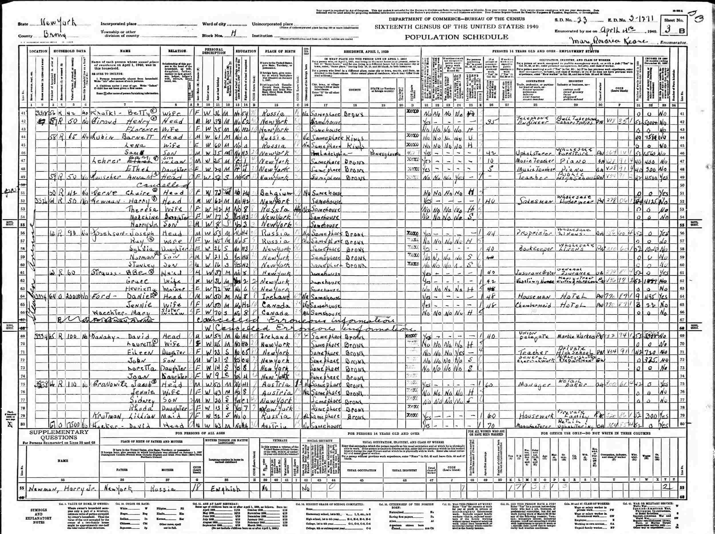 April 4, 1940 - 3326 Steuben Avenue, Block H, Supervisor's District 23, Enumeration District 3-1271, Bronx, New York.