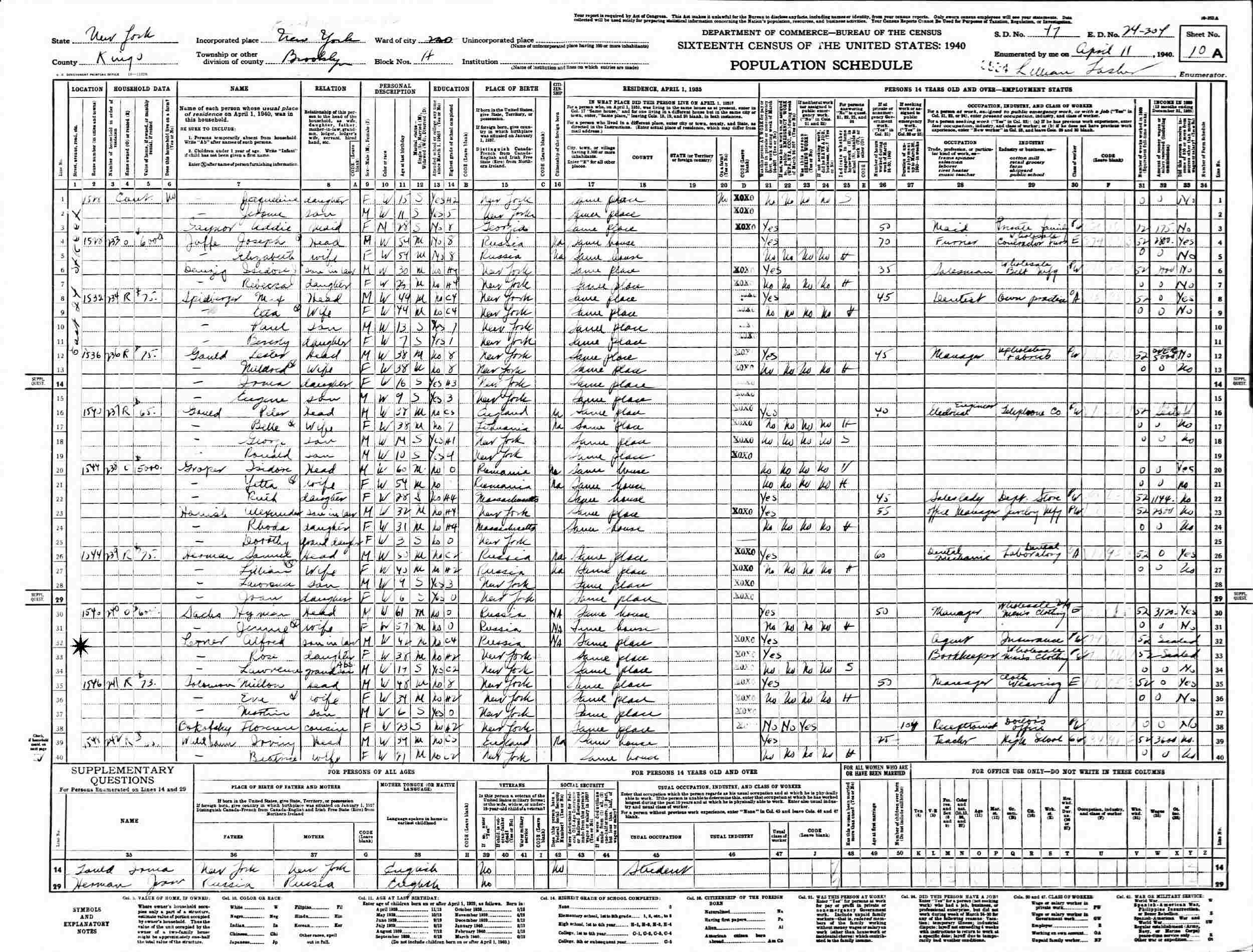 April 11, 1940 - 1546 E 24th Street, Assembly District 2, Block H, Supervisor's District 47, Enumeration District 24-304, Brooklyn, Kings County, New York.