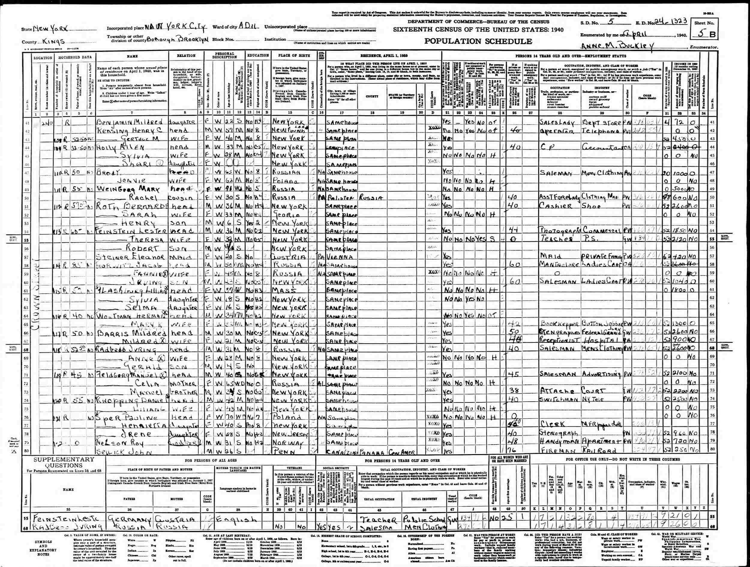 April 11, 1940 - 240 Crown Street, Assembly District 11, Supervisor's District 5, Enumeration District 24-1323, Brooklyn, Kings County, New York.