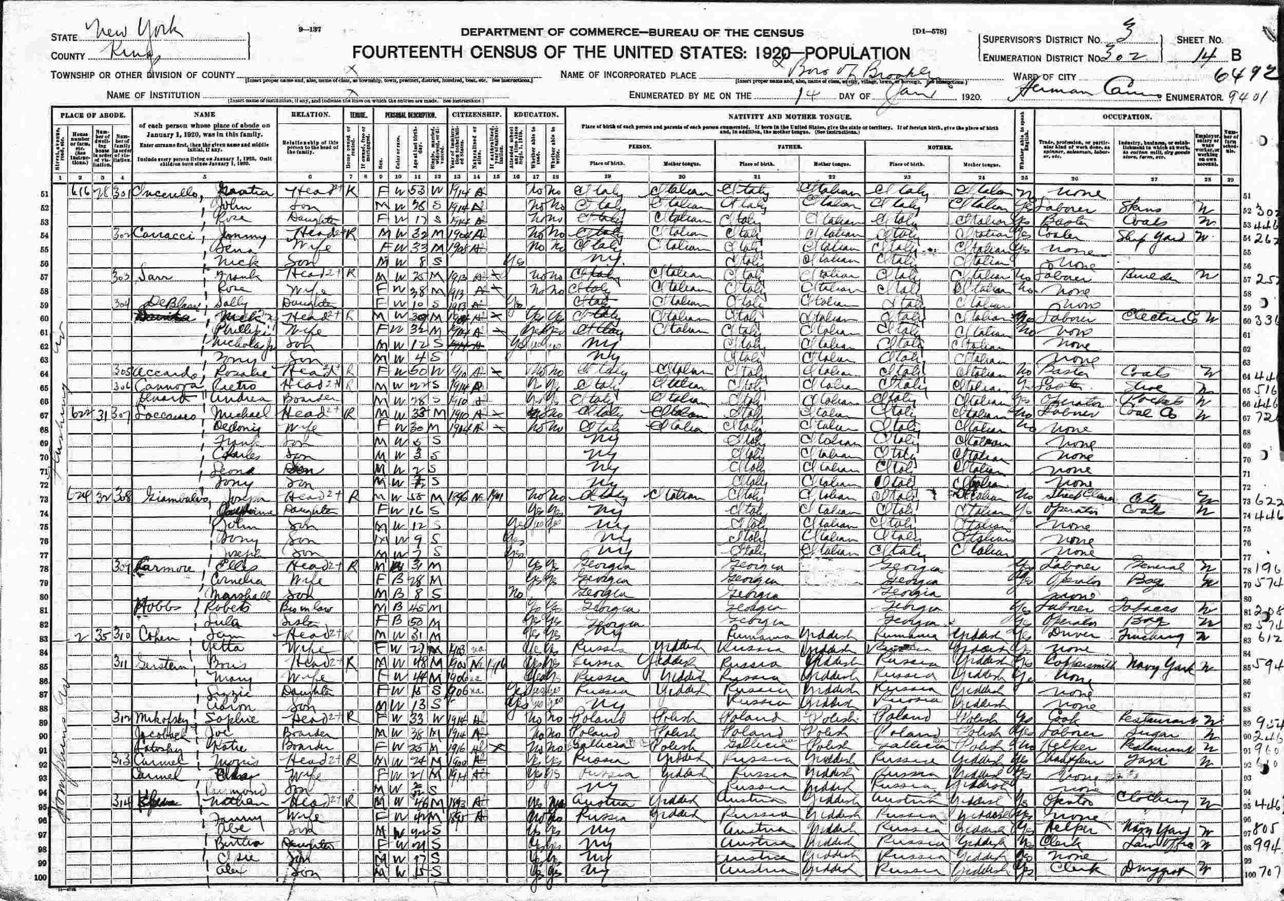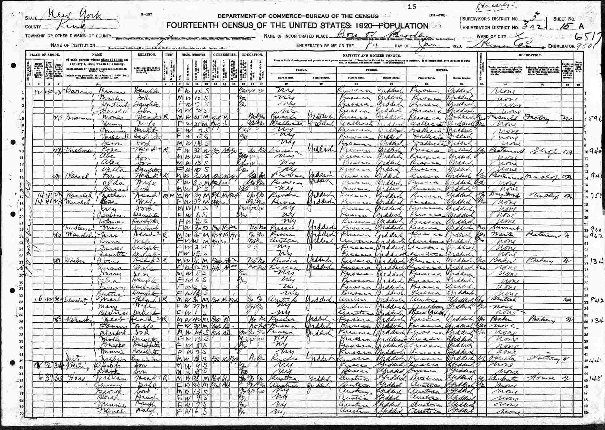 January 14, 1920 - 12 Tompkins Avenue, Supervisor's District 3, Enumeration District 302, Brooklyn, Kings County, New York.