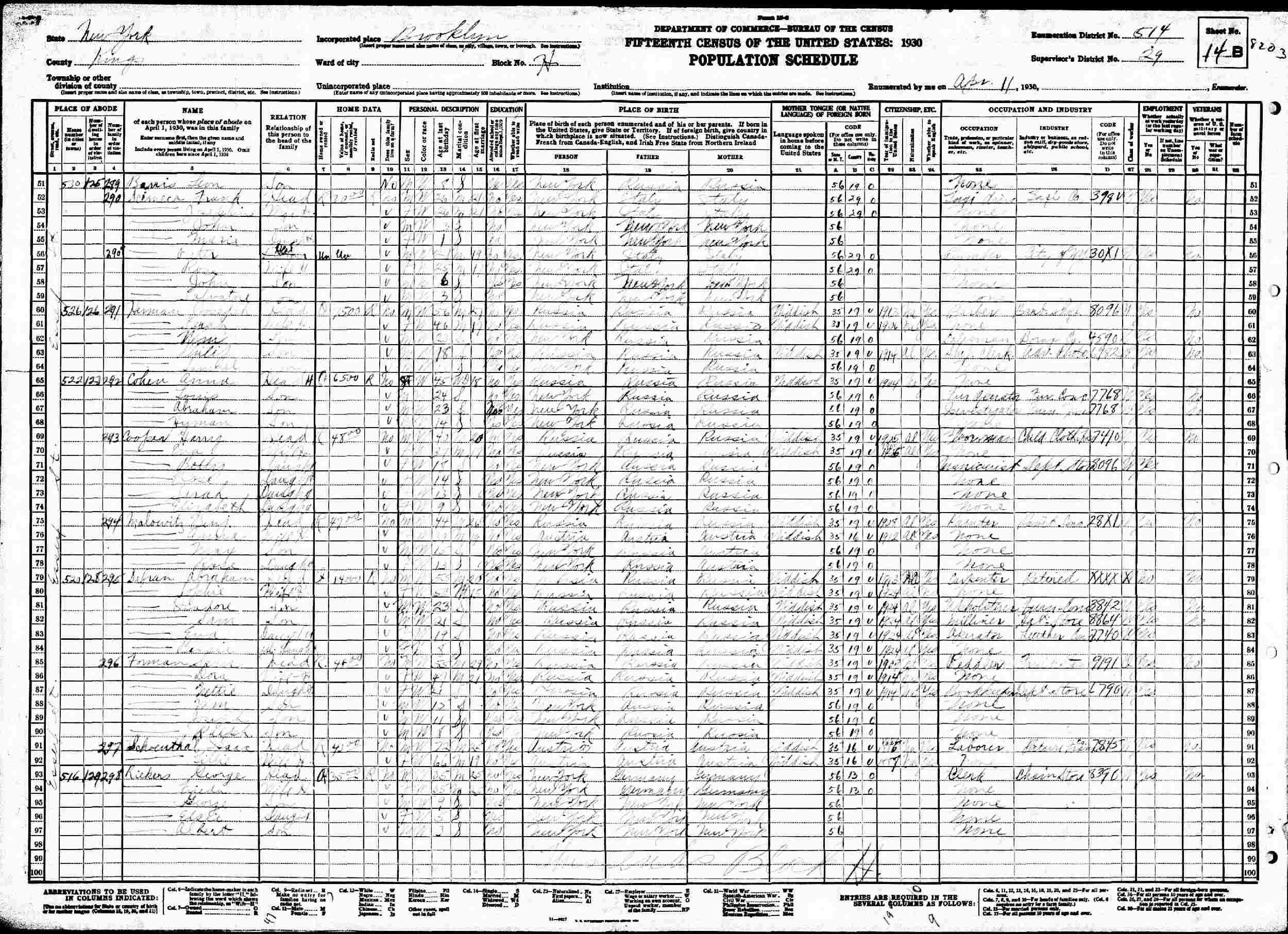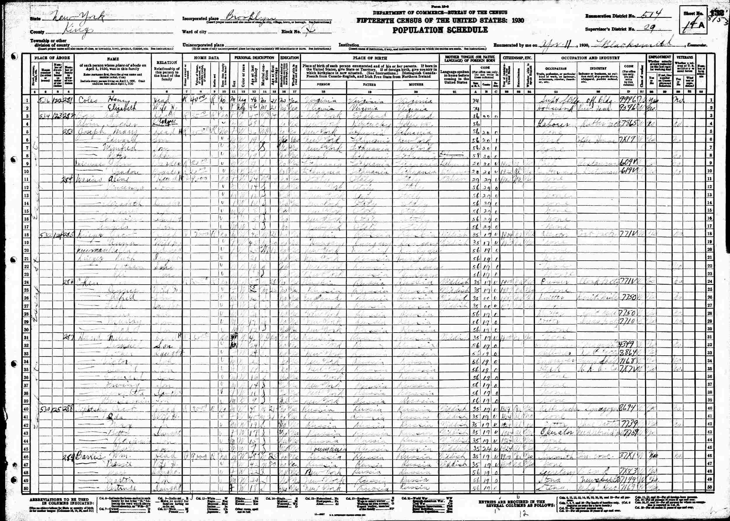 April 11, 1930 - 540 Essex Street, Block H, Supervisor's Distric 29, Enumeration District 514, Brooklyn, Kings County, New York.