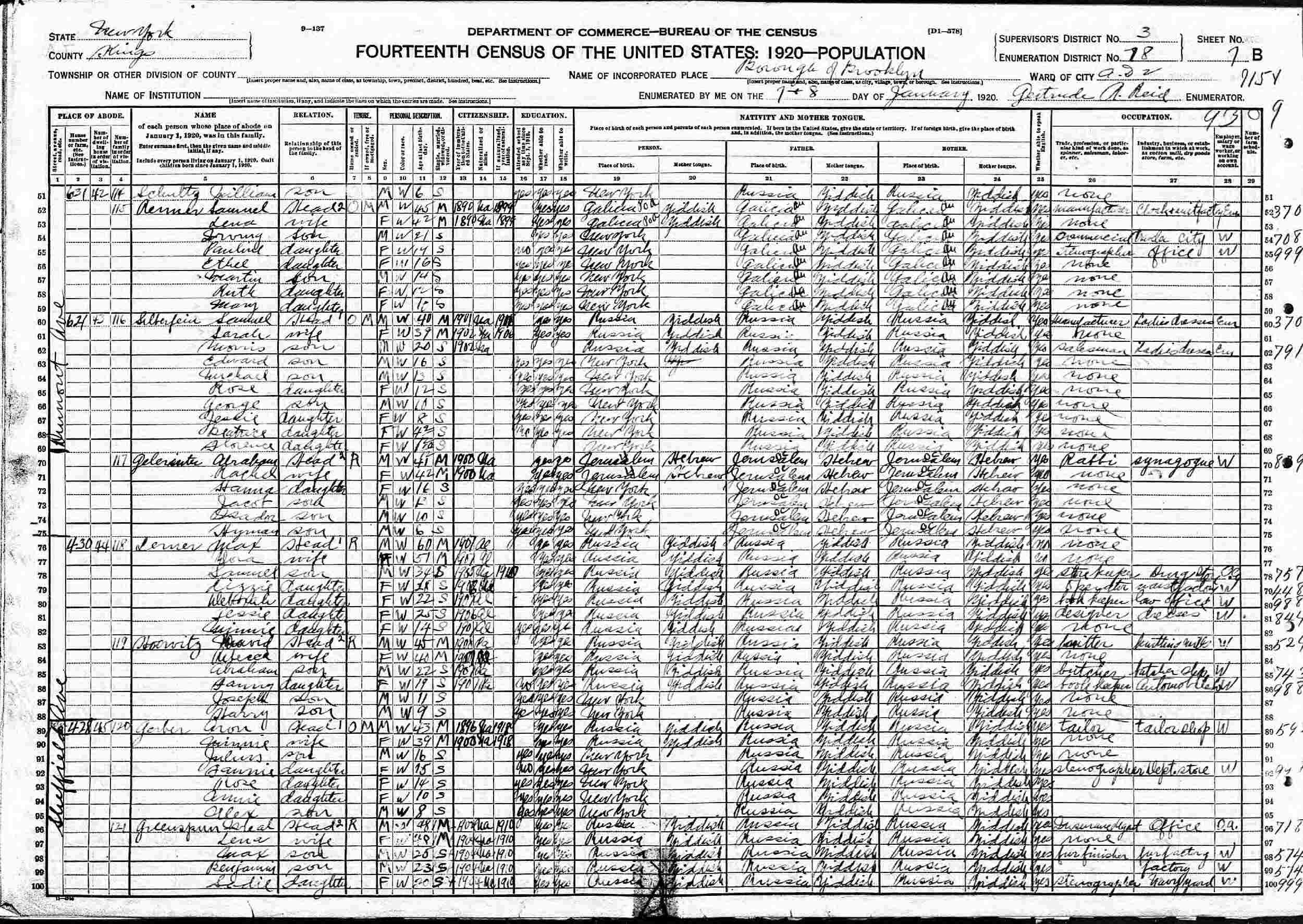 January 7-8, 1920 - 430 Sheffield Avenue, Assembly District 2, Supervisor's District 3, Enumeration District 78, Brooklyn, Kings County, New York.