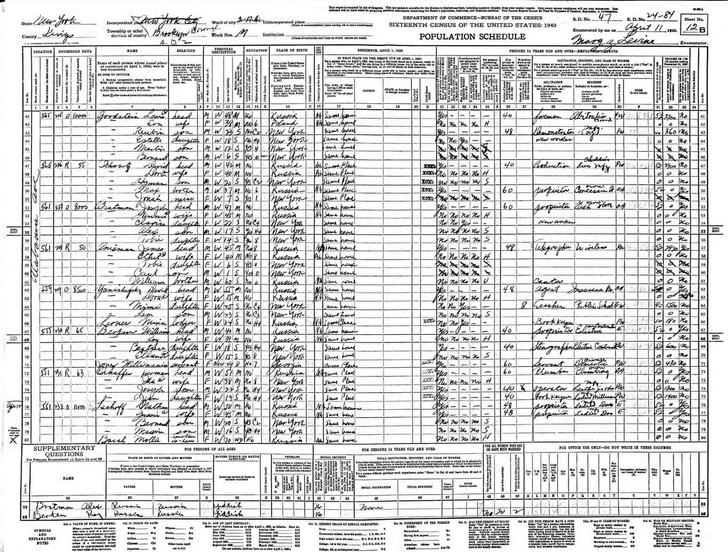 April 11, 1940 - 559 Alabama Avenue, Assembly District 2, Block M, Supervisor's District 47, Enumeration District 24-84, Brooklyn, Kings County, New York (w/brother-in-law David Yanishefsky and sister Dora).
