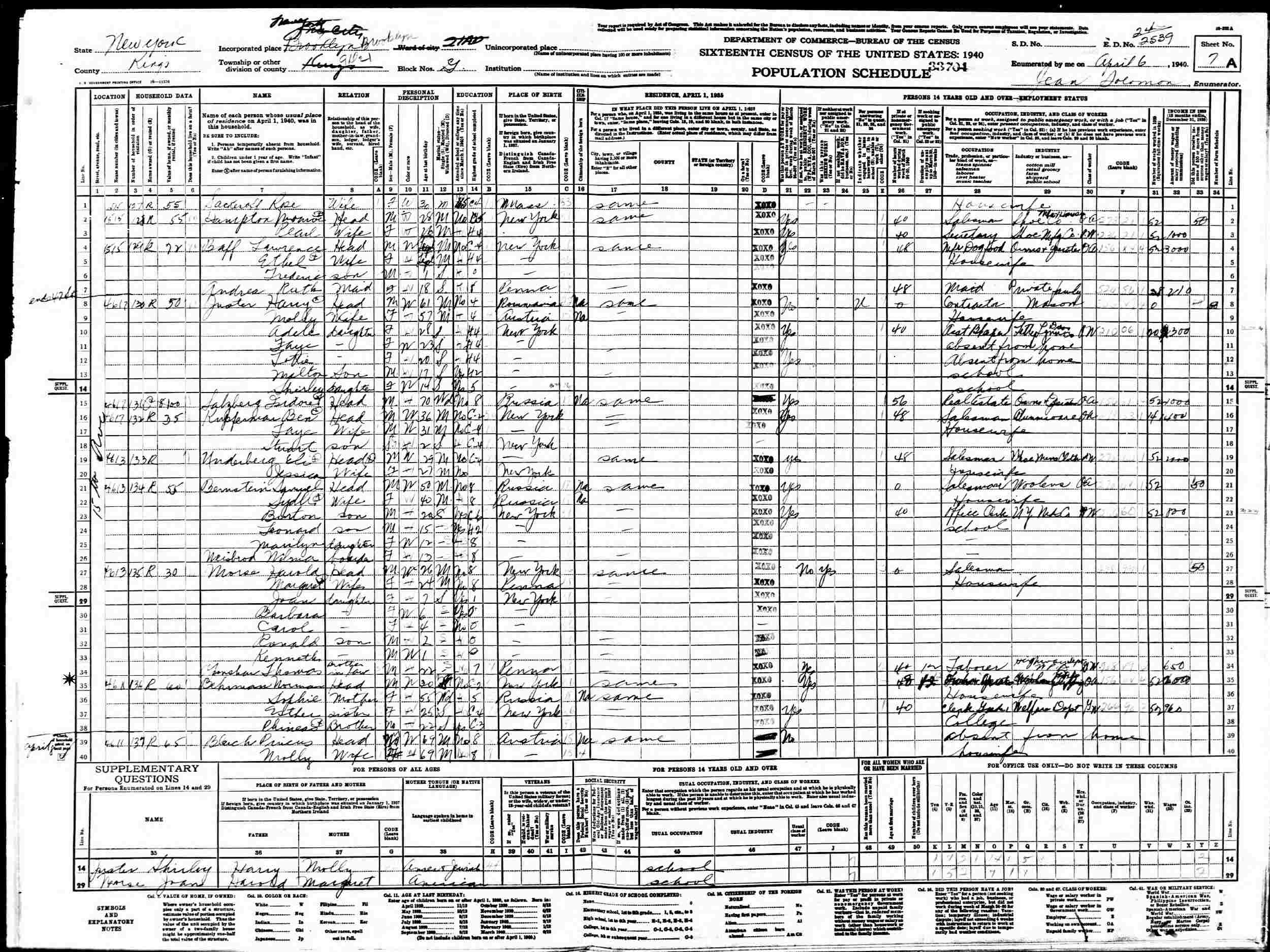 April 6, 1940 - 4613 15th Avenue, Assembly District 21, Block G, Enumeration District 24-2539, Brooklyn, Kings County, New York.