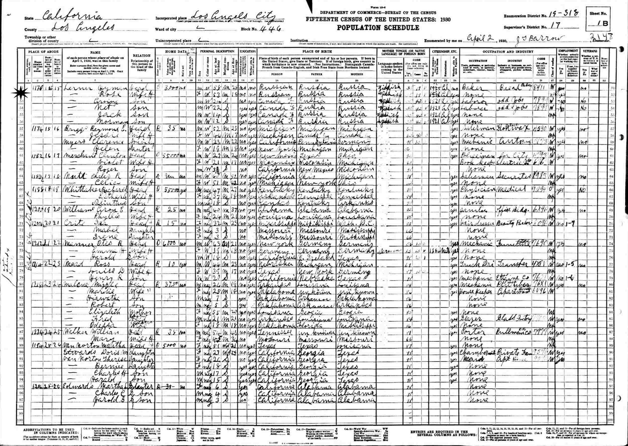 April 2, 1930 - 1170 East 54th Street, Block 446, Supervisor's District 17, Enumeration District 19-318, Los Angeles, Los Angeles County, California.