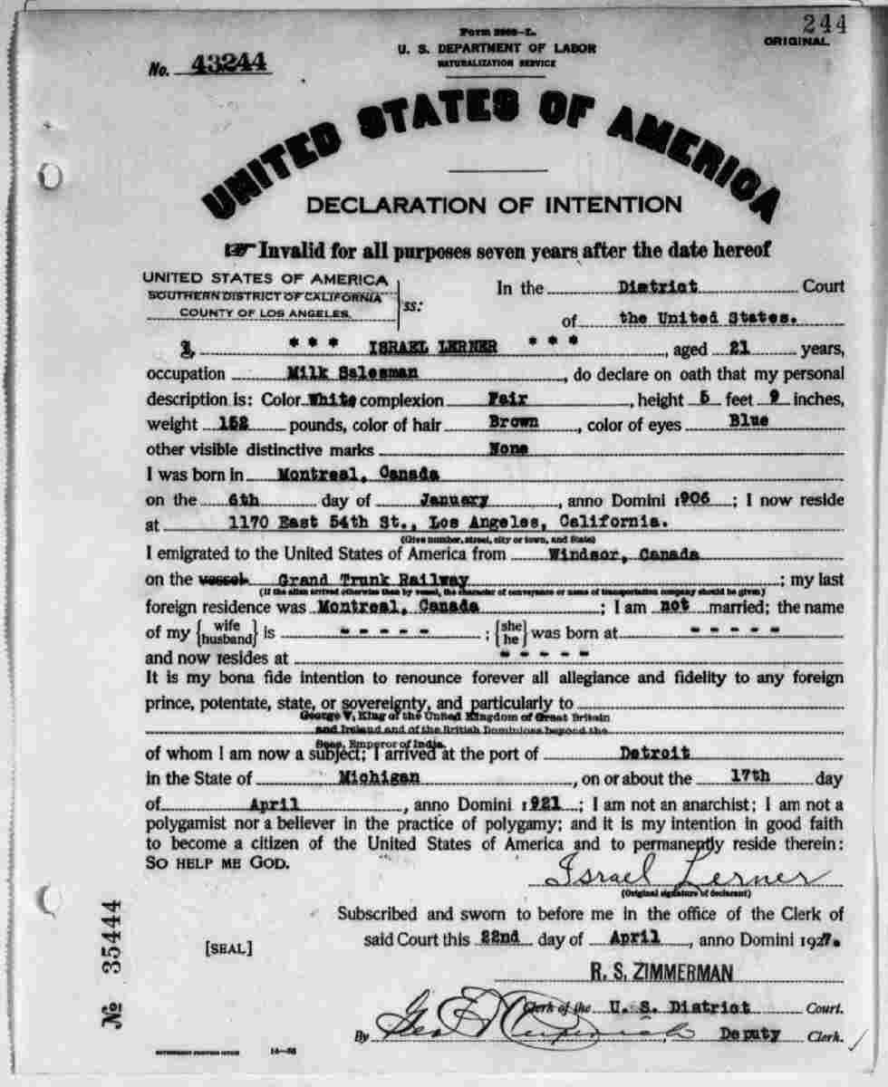 January 6, 1906 (U.S. Declaration of Intention for Naturalization Israel Lerner.)