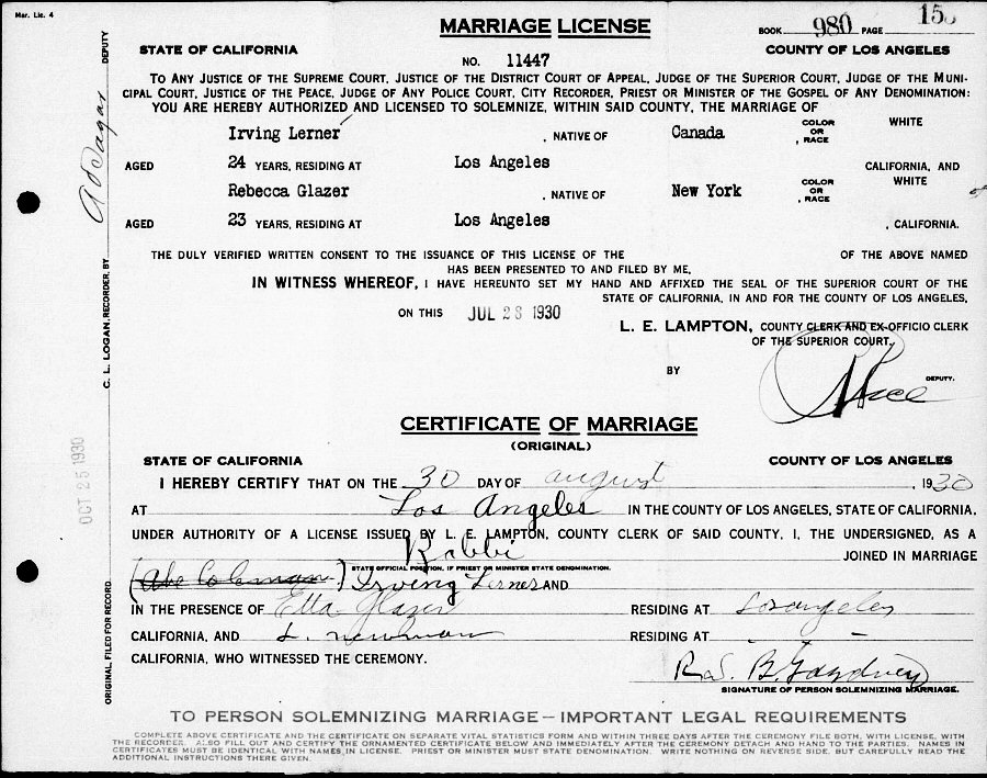 Married: Belle Rebecca Glazer about October 25, 1930 in Los Angeles, Los Angeles County, California. (Marriage Registered October 24, 1930).
