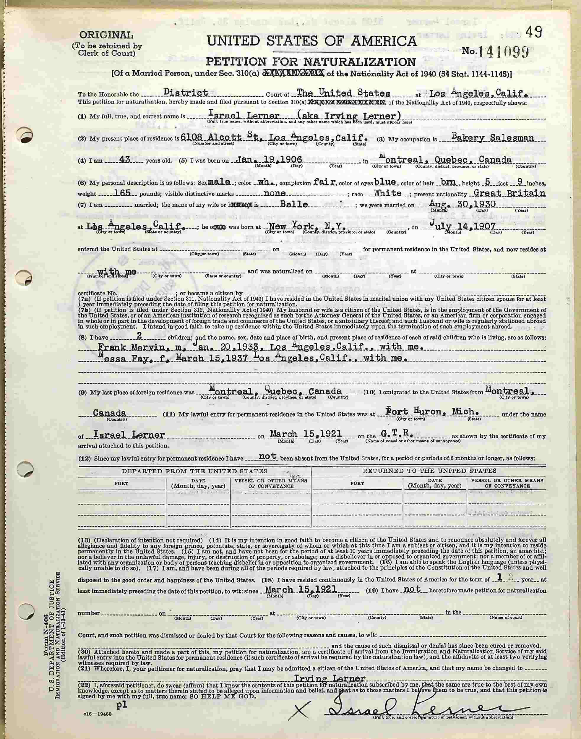 Naturalization: October 14, 1949 - Los Angeles, Los Angeles County, California.